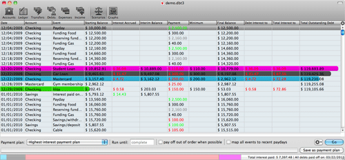 - Once it's complete, you can see the report of how to pay down your debts. It'll tell you the date an event occurs, what it was, which bank account it impacts,